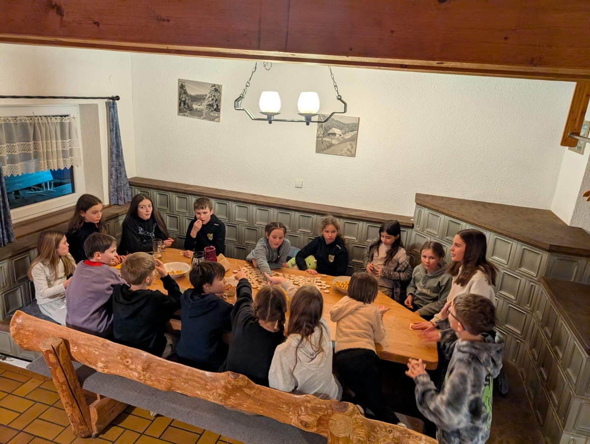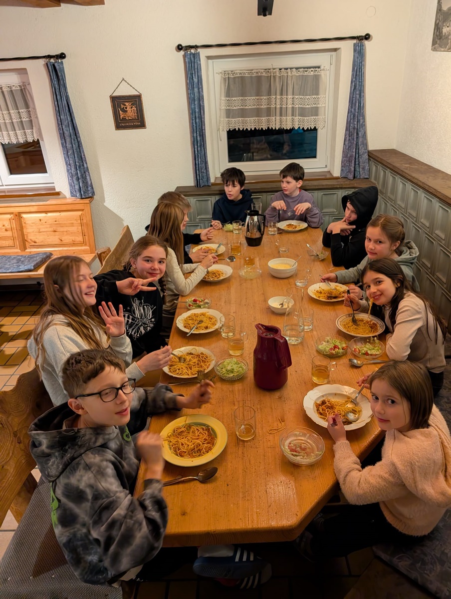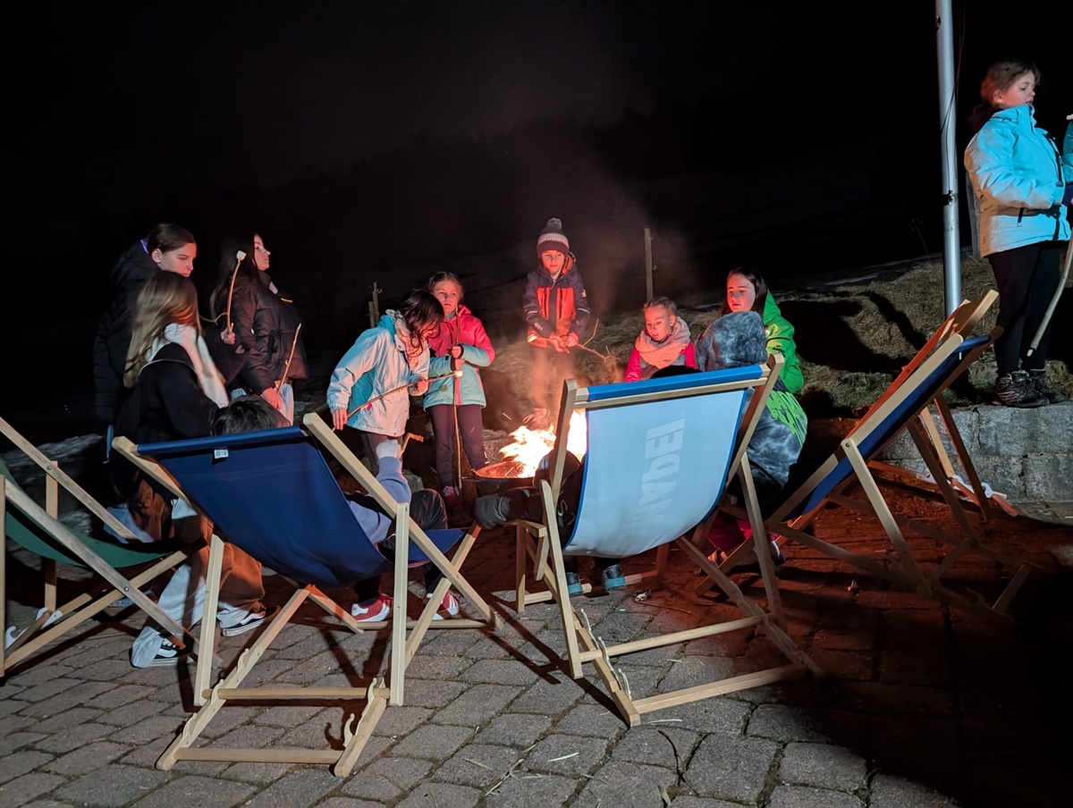 Nach dem gemeinsamen Spaghetti-Essen versammelten sich die Kinder vor der Hütte, um Marshmallows über dem offenen Feuer zu rösten. Bei einer entspannten Runde am Lagerfeuer war die Stimmung perfekt, bevor es mit einem aufregenden Spieleabend weiterging. Um 22:30 Uhr endete der Abend mit dem Zapfenstreich, sodass alle gut ausgeruht und fit für den kommenden Skitag waren.