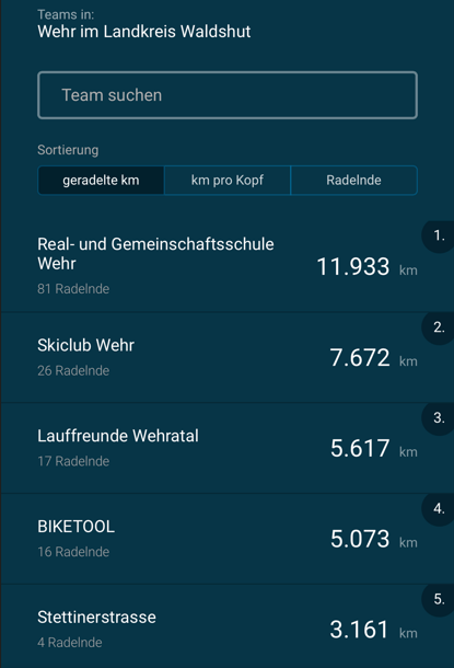 Für das Team „Skiclub Wehr“ waren 25 Personen aktiv die in den 3 Wochen zusammen 7672km radelten. In der Wertung der Stadt Wehr fuhren sie damit auf Platz 2. Die meisten Kilometer legte Hermfred Gohn für den Verein zurück. Er steuerte alleine 856km zu dem Gesamtergebnis bei.